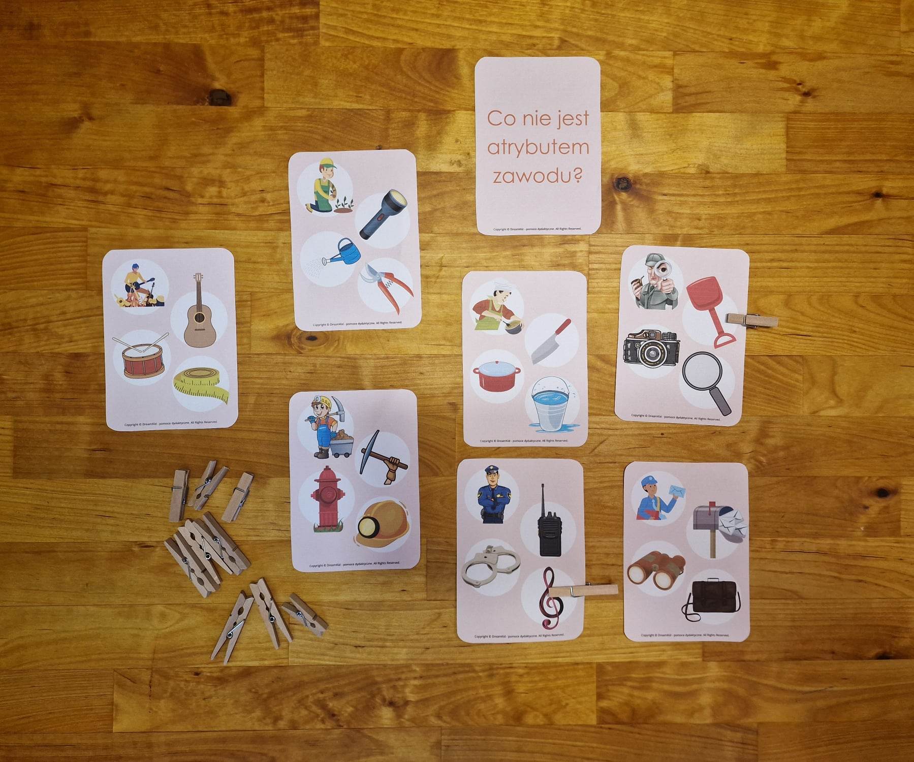 Zestaw zawiera 19 karty + okładkę do przechowywania. Zadaniem dziecka jest zaznaczenie klamerką obrazka, który nie pasuje do danego zawodu. Pomoc ta ćwiczy motorykę małą oraz dużą, a także rozwija umiejętność spostrzegawczości, oraz umiejętność logicznego myślenia.