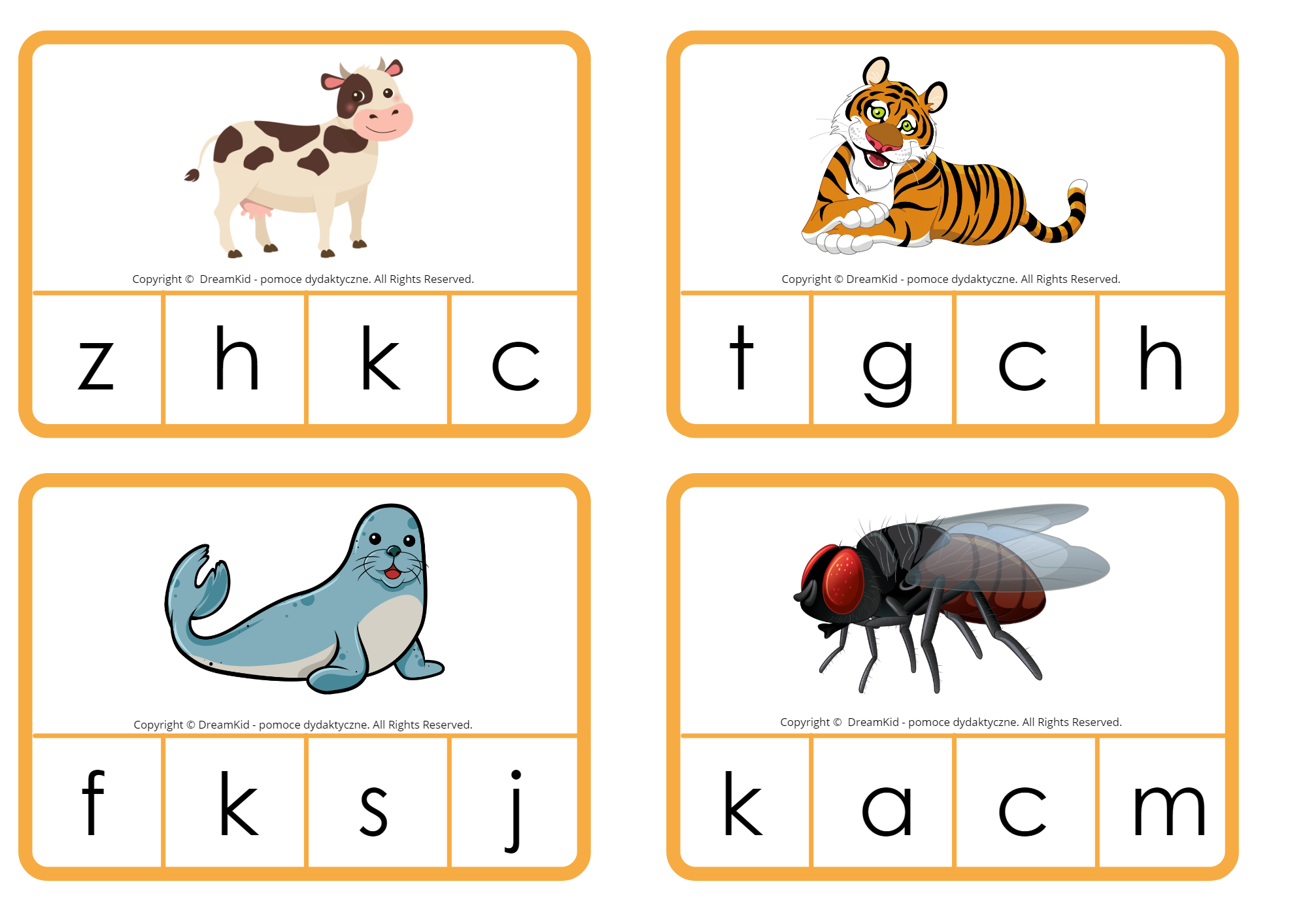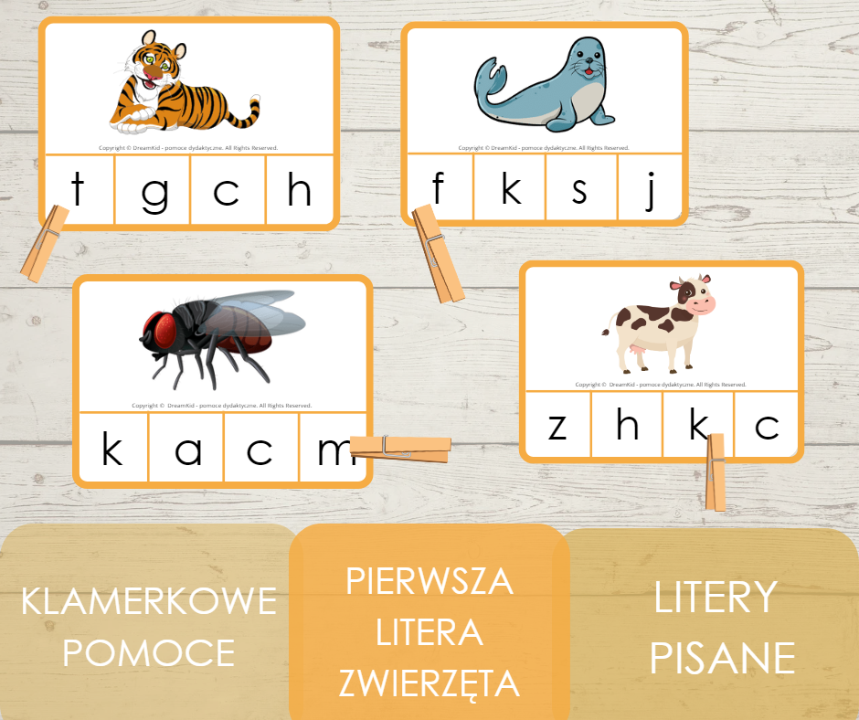 Zestaw zawiera 40 karty. Zadaniem dziecka jest zaznaczenie klamerką litery na którą rozpoczyna się zwierzątko z obrazka. Pomoc ta ćwiczy motorykę małą oraz dużą, a także rozwija umiejętność spostrzegawczości, oraz umiejętność czytania i rozpoznawania liter. Litery pisane.