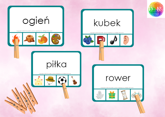 Zestaw zawiera 116 karty. Zadaniem dziecka jest zaznaczenie klamerką obrazka odpowiadającemu wyrazowi powyżej. Pomoc ta ćwiczy motorykę małą oraz dużą, a także rozwija umiejętność spostrzegawczości, oraz umiejętność czytania. Litery pisane.