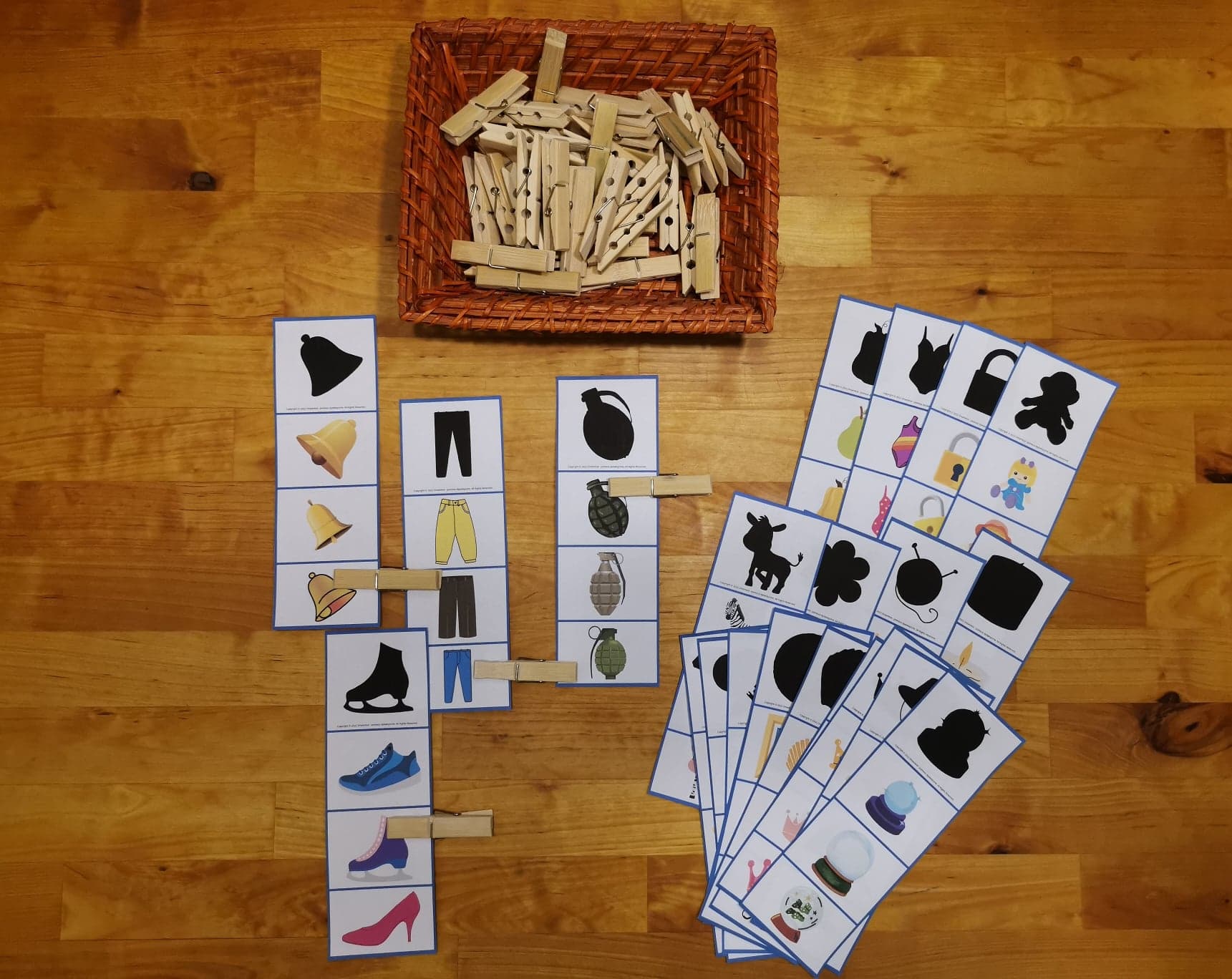 Zestaw zawiera 32 karty. Zadaniem dziecka jest zaznaczenie klamerką obrazku pasującego do cienia. Pomoc ta ćwiczy motorykę małą oraz dużą, a także rozwija umiejętność spostrzegawczości.